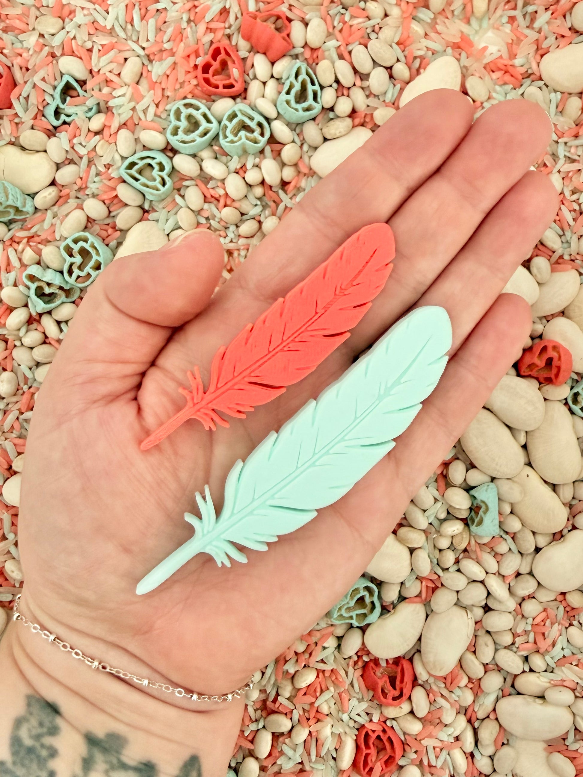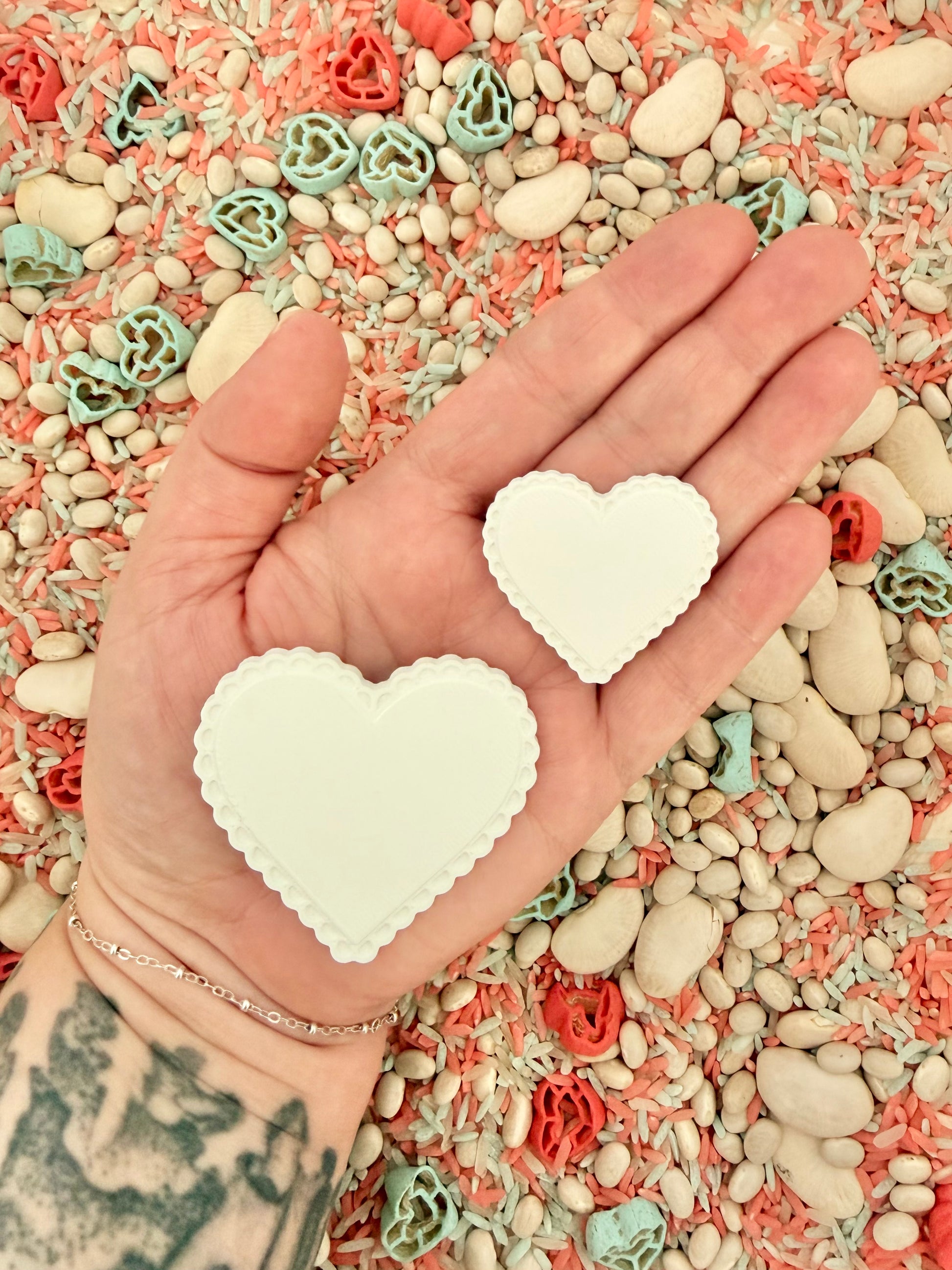 This thoughtfully curated, 3D printed set includes 10 loose pieces total, featuring two sizes of hearts and feathers, all designed to invite open-ended, imaginative play. With their smooth finish, gentle scalloped edges and beautiful Valentine inspired colours, these pieces are perfect for sorting, counting, pattern making and small world scenes.