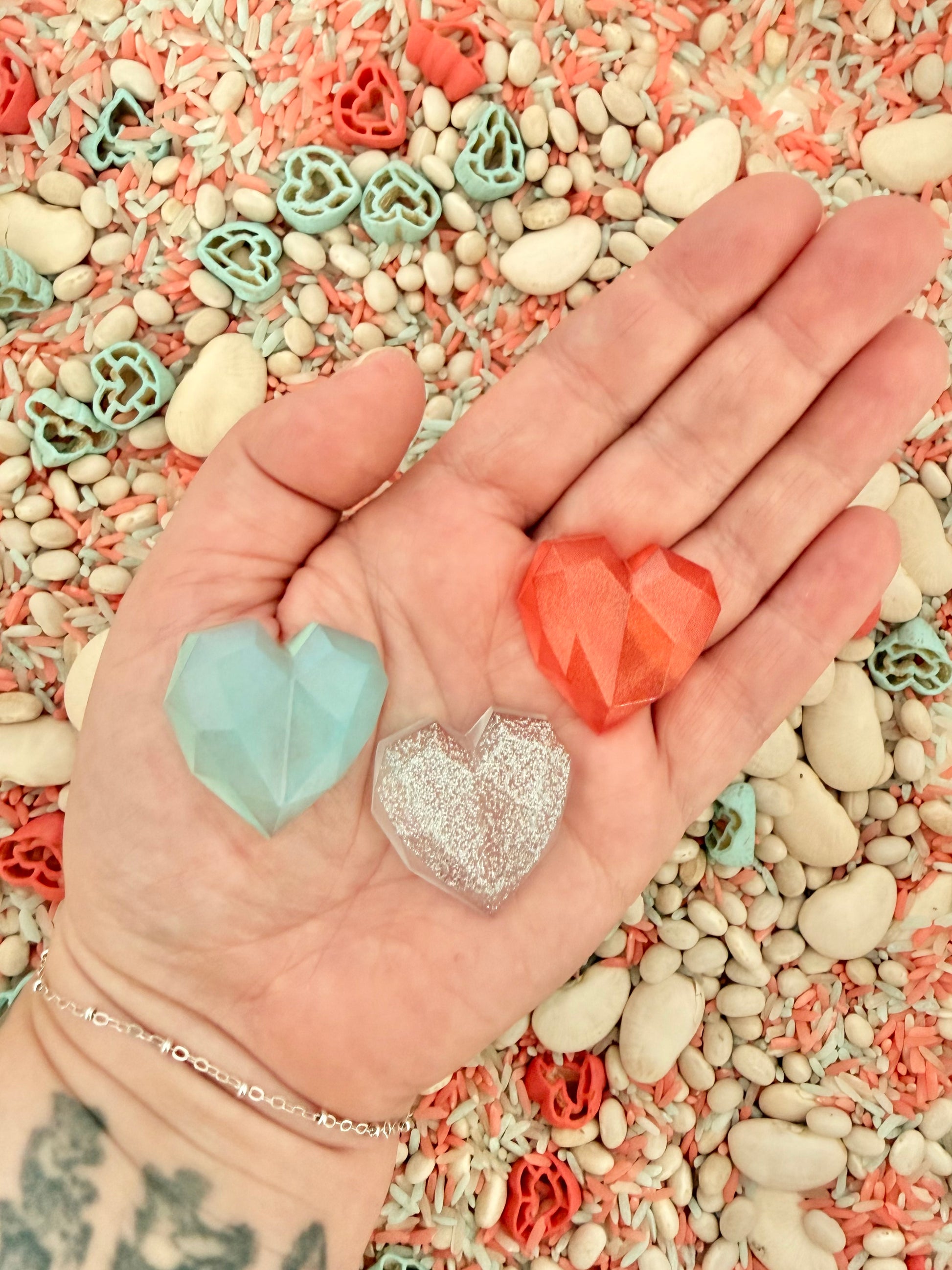 Add a little sparkle and charm to sensory play with our Resin Heart Loose Pieces. Each set includes 10 beautifully faceted resin hearts, designed to catch the light and invite curiosity through colour, texture, and shine. With their smooth finish and gem-like shape, these hearts are perfect for sorting, counting, pattern making, and adding a special touch to sensory bins and small world play.
