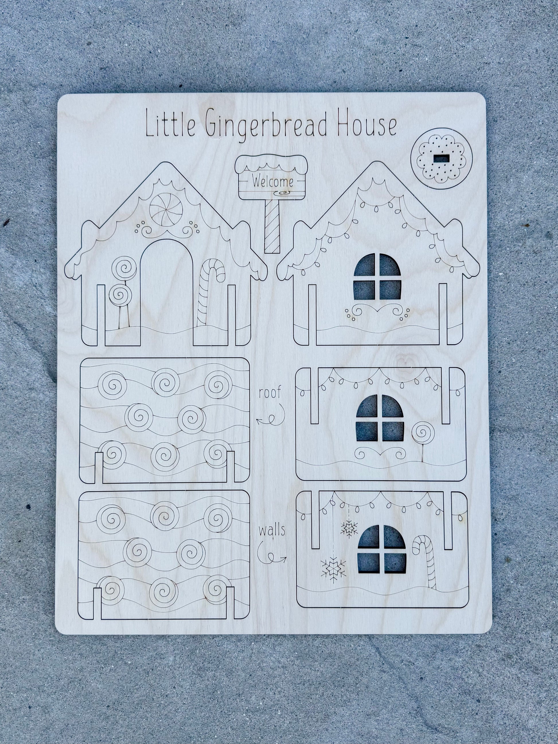 Our wooden gingerbread paint kit is made from Baltic birch plywood. The gingerbread house with welcome sign comes on one sheet of plywood and the additional pieces and accessories come on a separate sheet of plywood. All pieces have tabs that allow you to easily push them out of the main sheet. Each set is sanded for a smooth surface, making it easier to paint with the acrylic paint and paint brush that is provided